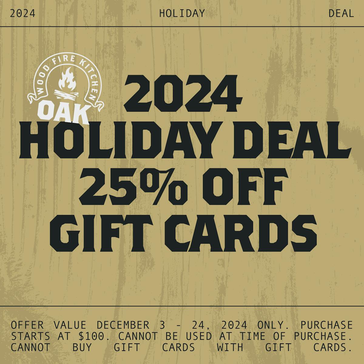 The Holidays are in full swing and we’ve got the perfect gift idea for the foodies in your life! From now until December 24th, enjoy 25% off all gift cards of $100 or more! Treat family & friends to a memorable dining experience featuring wood-fired pizzas, hearty pastas, juicy burgers, fine wine, decadent desserts, and so much more. It’s a delicious way to celebrate the season and share the joy of flavorful food with loved ones. Don’t miss this limited-time offer—because good food is the gift that keeps on giving!